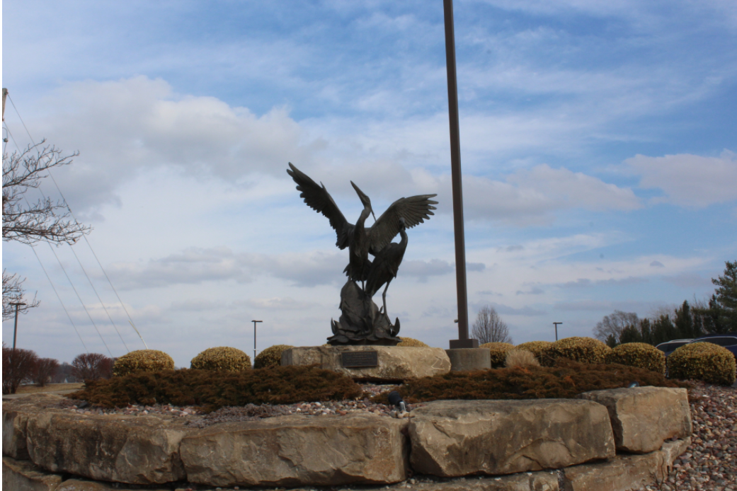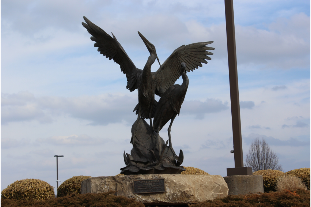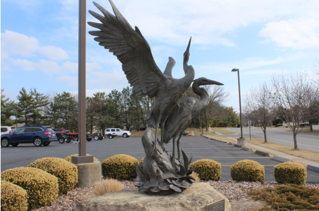A bronze depiction of two herons standing on an outcropping of rocks. One heron has its wings spread as if about to take flight. The other stands watching something in front of it.