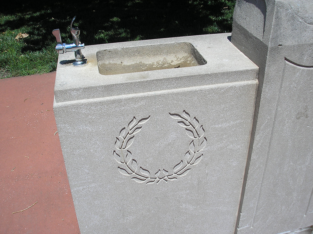 Located in the Kansas City Zoo on the Beaks and Feet path, not too far from the flamingos near the beginning of the African Veldt section of the zoo is this working drinking fountain. It was originally located near the sea lion pool but was conserved, replumbed and relocated to its current location in 2000.