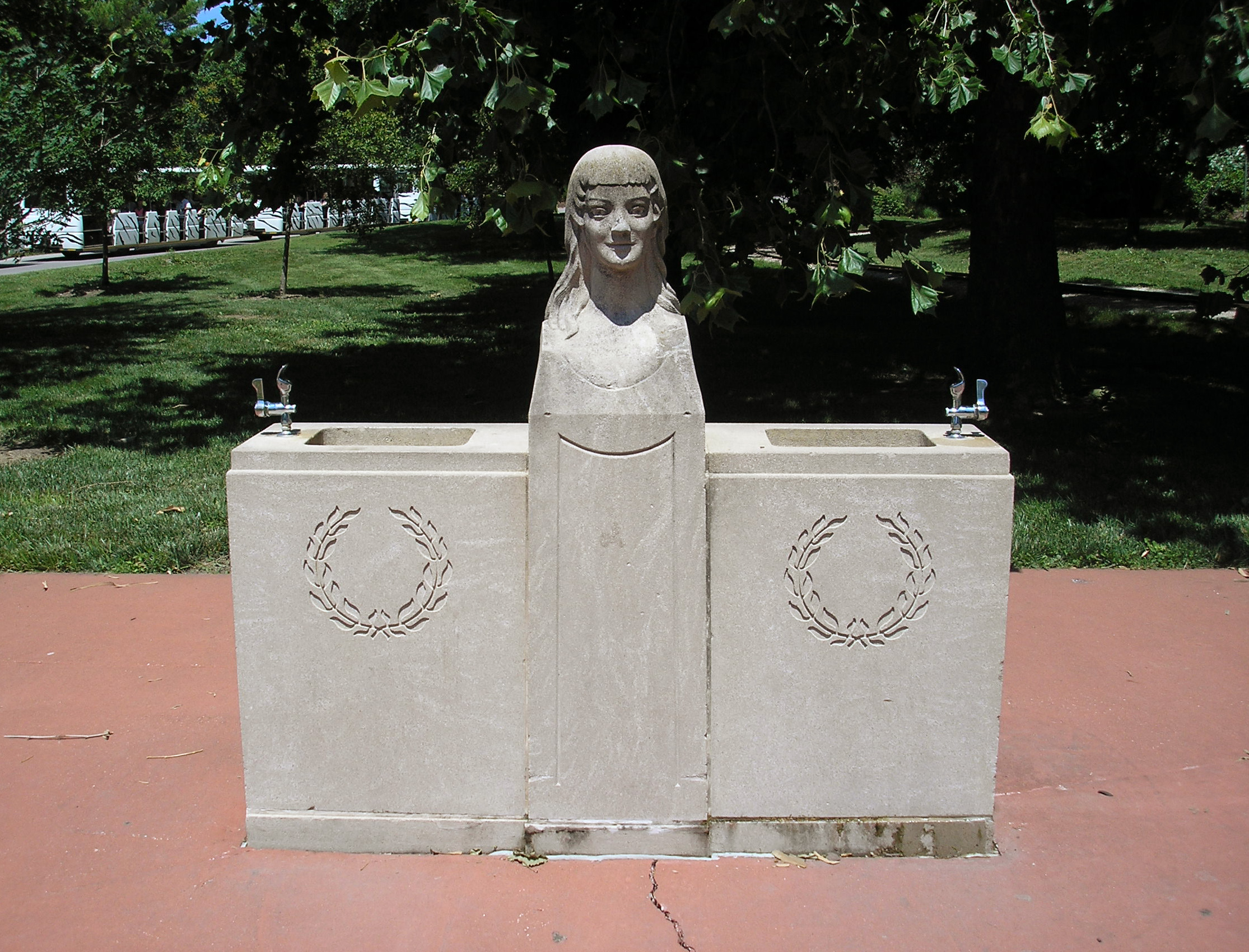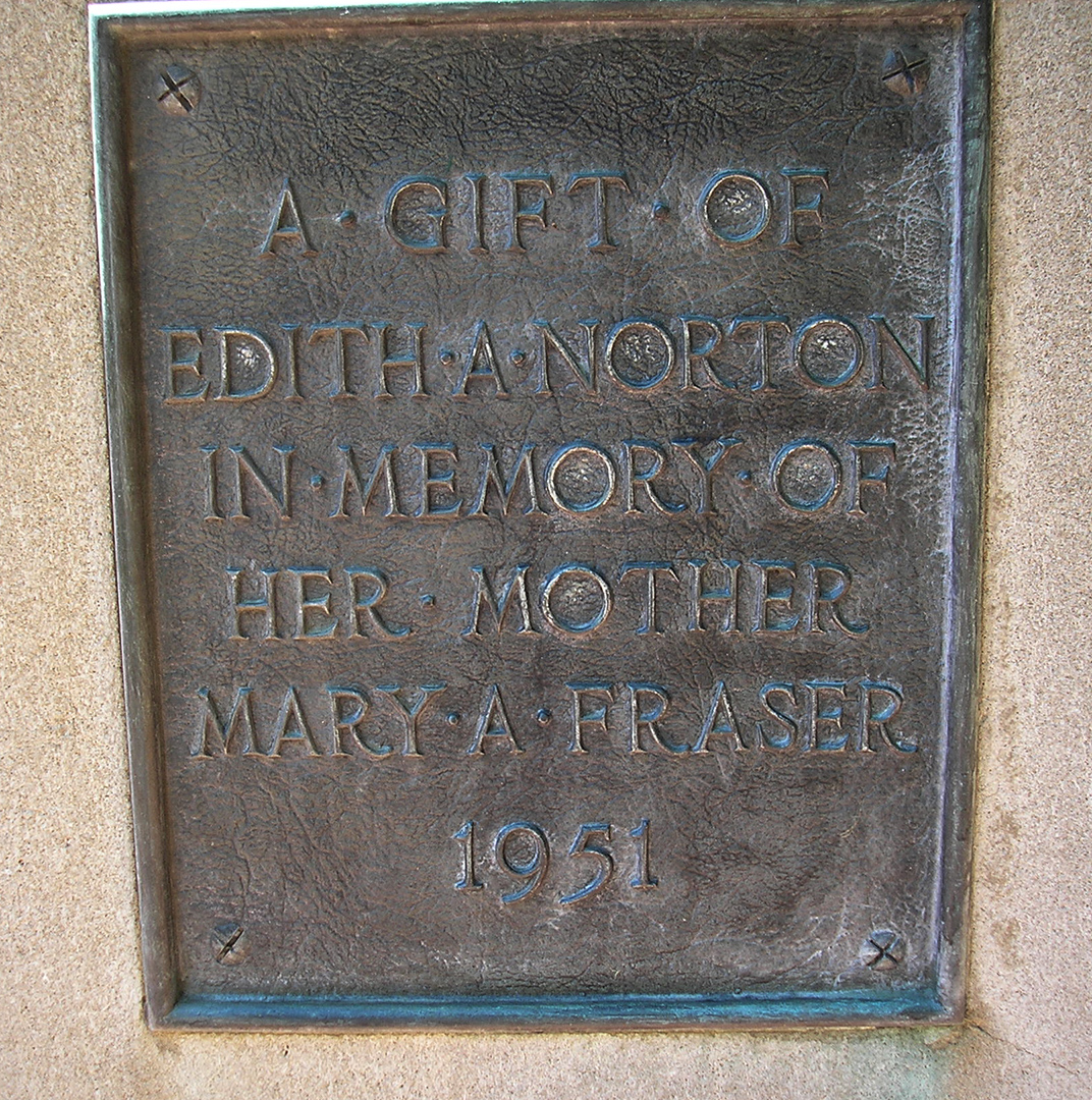 It was donated by Edith A. Norton in memory of her mother, Mary A. Fraser. There is a plaque on each end stating the gift and the memorial. It is an art deco style structure with a sculpture of a young woman atop a limestone base. There is a working drinking fountain on each side of the sculpture. There are two small fountains at the beginning of the path to the fountain.