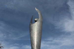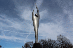 The stainless-steel work by artist Jac T. Bowen is an abstract figure with its arms raised upwards symbolizing youth striving for greater goals.