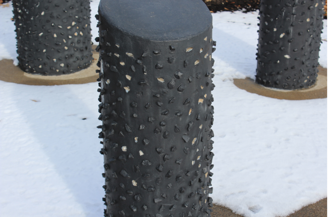 The twelve-and-a-half-foot tall figure stands atop a pedestal made of concrete with exposed aggregate. Two smaller pedestals, one with the dedicatory plaque and one unadorned, sit close by. All three pedestals stand on a round concrete base approximately twelve feet in diameter.